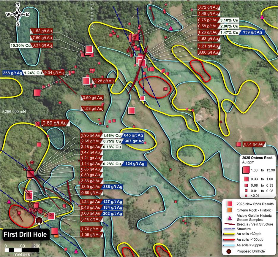 The drilling will test whether the northwest trending mineralised structures discovered by SPMC (and described in September 17, 2025, and October 6, 2025, news releases) are surface expressions of deeper epithermal Au-Cu veins, like those currently mined by K92 at their Kora and Judd deposits.