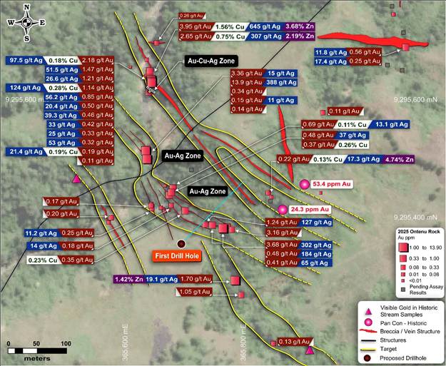 The Ontenu NE prospect is part of the wider 5 x 3km epithermal footprint of the Ontenu Prospect. Ontenu NE is a 2 sq km zone with multiple structures outlined by surface mapping and soil geochemical anomalies,  up to 1200m strike length (Figure 1). The soil anomalies are currently open to the northwest. Refer Appendix 1 for full table of rock results.