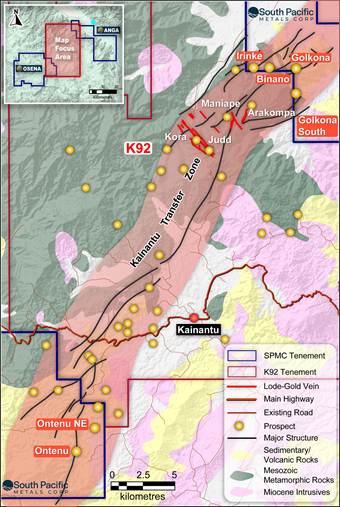 Figure 6. Kainantu District with SPMC’s Osena Project (SW) and Anga Project (NE) relative to K92 Mining Ltd.’s deposits.