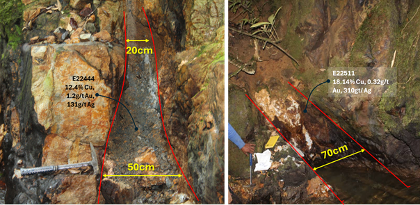 • 21.2% Cu, 214 g/t Ag, (0.41g/t Au) (0.25m massive sulphide in splay structure)